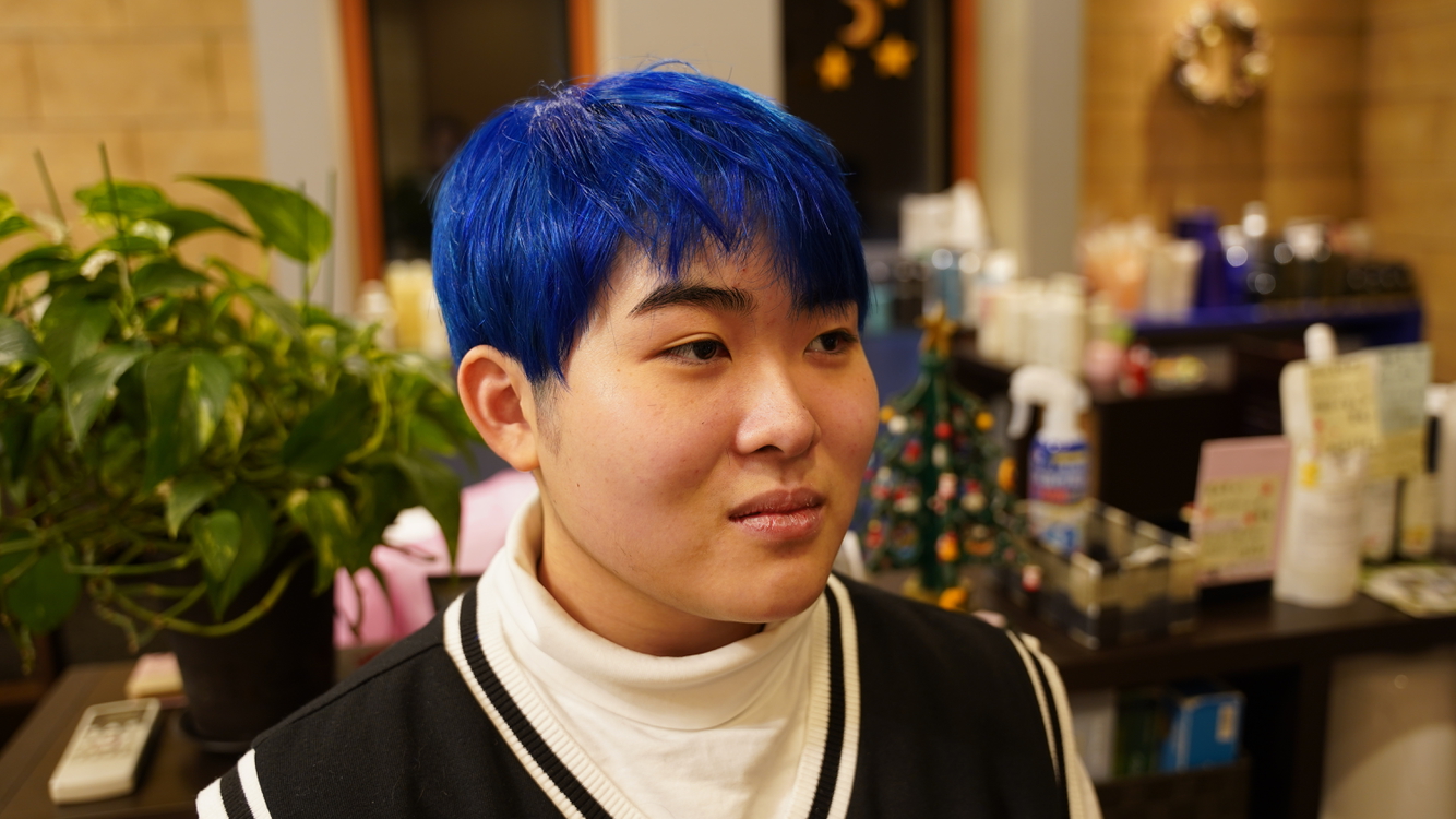 コスプレイヤーさんが使ってるウイックみたいな鮮やかブルーです。